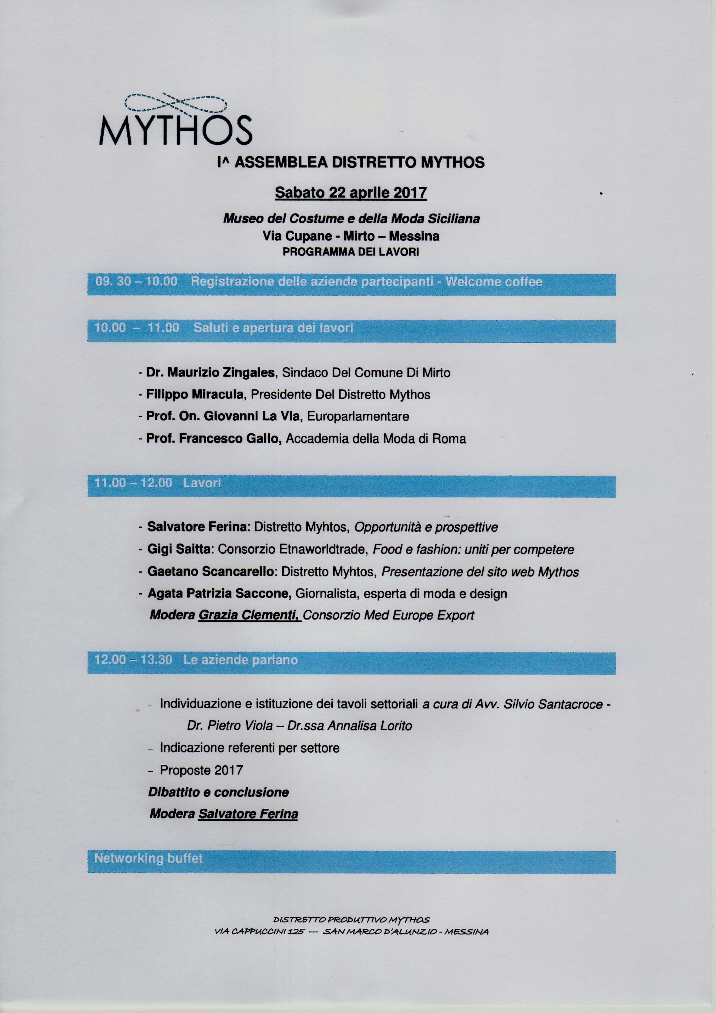 Sabato 22 aprile 2017, presso il Museo del Costume e della Moda Siciliana di Mirto (ME), si svolgerà la 1° Assemblea Distretto Mythos... Vedi il Programma: Seguici anche su